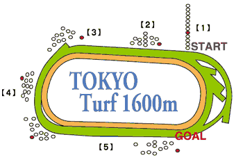スタートしたらすぐに「押さえ」(方向キー「下」押しっぱなし)てスピードをキープし、他の馬を先にいかせて馬群の一番後ろにつけます。