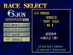 SELECT画面でPRESEASONを選択するとHORSE SELECT画面になります。ここで騎乗したい馬を選びます。初心者の方はGIキーを押してGI勝利馬を選ぶとよいでしょう。