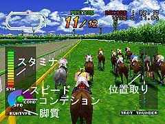 レースの道中、自分の操る馬を脚質に合わせて馬群のちょうど良い位置につけることがレースを勝つ為に必要です。レーダーを参考にして手綱をうまくさばき、ベストの位置をキープしましょう。この時気を付けるのは、不用意に他馬と接触しないことです。気性の悪い馬はそれだけでコンディションが悪くなってしまいます。また、ムチの使い過ぎの禁物です。スタミナの消費が大きく、最後の直線での脚色に影響してきます。スピードの加減を手綱一つで自在に操れるようになれば一人前です。さらに、タイム表示とハロン棒によってペースを判断し、ラストスパートをしかけるタイミングをつかめるようになればリーディングジョッキーも夢ではありません。