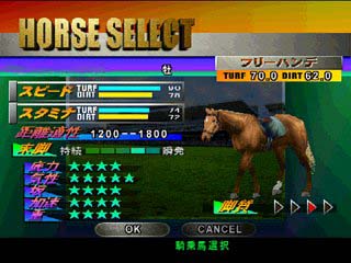| 新パラメーター追加!! 馬データに、新たに2つの新パラメーターが追加されました。 ・末脚タイプ…スパート時の走りのタイプを設定したもの 瞬発型から持続型まで数段階のレベルが あります。 ・坂適性 …坂道にどれぐらい強いかというもの 適性が高いほど坂道で速く走れます。 この2つのパラメーターの追加により、 馬たちの個性が大幅に広がり、 また、レースごとの違ったかけひきを楽しむことが できるようになりました。 |
