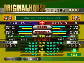 オリジナルホースの能力は君の騎乗次第! オリジナルホースの強さは、親馬のパラメーター のみで決まるのではなく、自分の騎乗結果が 影響します。夢の最強馬を作り出せるかどうかは 貴方の腕次第なのです! |