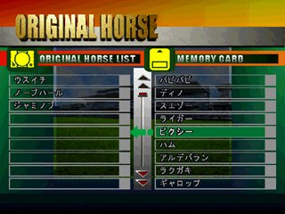 | オリジナルホース 「自分だけの馬に乗りたい」という数多くの要望に 応えて、オリジナルホースが作れるようになりました。 引退した自分のお手馬たちを繁殖入りさせ、 掛け合わせることで誕生させられます。 オリジナルホースは作成後、自分のお手馬として すぐに使うことができ、データをセーブしておくことで、 プラクティスモード、VSモードでも騎乗可能に なります。 自分のオリジナルホースで友達や実際の名馬と 対戦することも! |